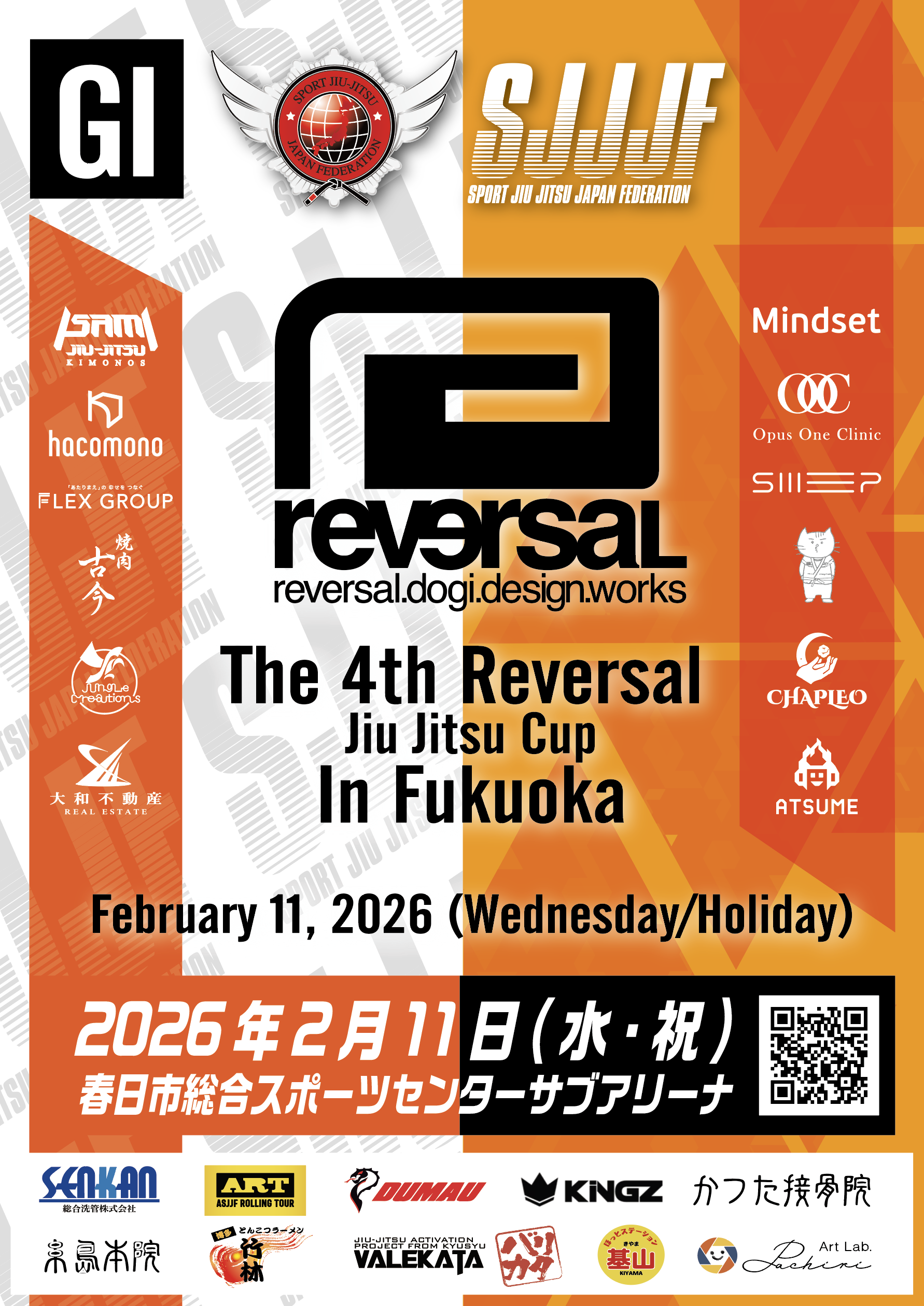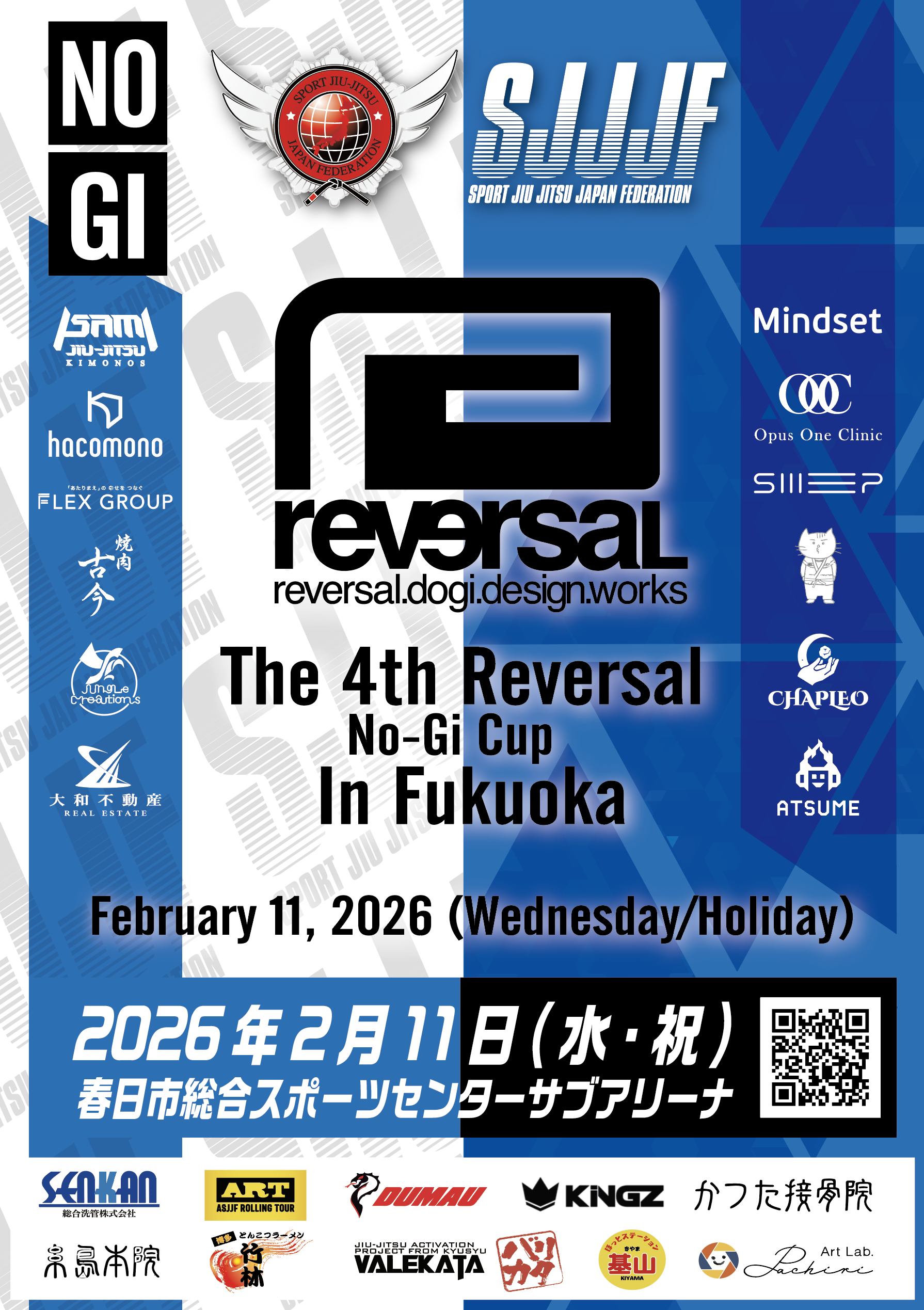 The 4th Reversal Jiu Jitsu Cup In Fukuoka 2026年 2月 11日(水・祝) 福岡県 春日市総合スポーツセンター 大会概要・エントリーページ 参加者一覧 |